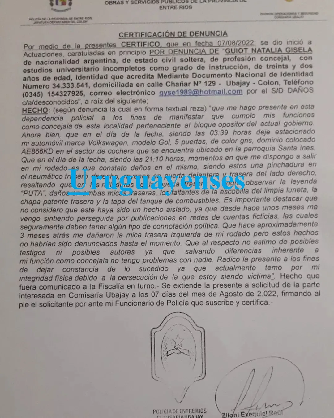 A raíz de daños provocados en un rodado, ocurridos en la víspera, en la localidad de Ubajay, personal de comisaría de esta jurisdicción inició actuaciones, en virtud de una denuncia radicada por la concejal Natalia Guiot una concejal de esa comuna. De este hecho se iniciaron Actuaciones de rigor, como así también una pesquisa, con conocimiento y directivas de la unidad Fiscal de Colon. En la denuncia ante la Policía, Guiot detalló que a su auto le pincharon uno de sus neumáticos, dañaron las micas, le quitaron unas de sus chapas patentes y con rayones en la pintura, escribieron en una de las puertas la palabra “puta”.