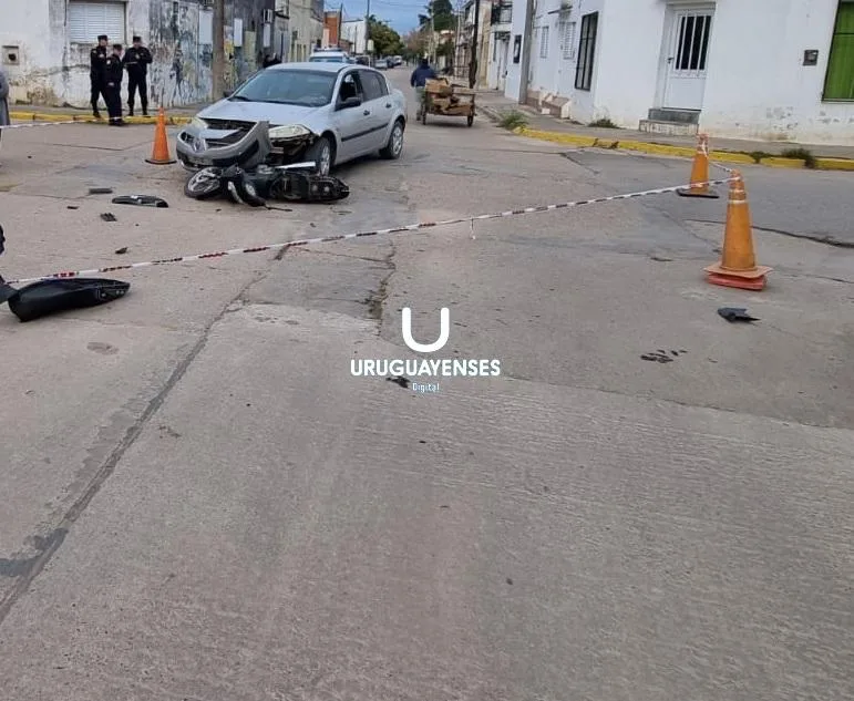 Nogoyá: En la fecha siendo 16:49 hs., se tomó conocimiento de un siniestro vial ocurrido en calle San Luis y San Martín de nuestra ciudad, donde posiblemente habría una persona lesionada. El accidente se había producido entre un automóvil Renault Megane Confort, conducido por un ciudadano de 29 años, quien era acompañado por una femenina de 26 años de edad; siendo el otro vehículo interviniente una moto marca Guerrero Trip 110cc, conducida por un joven de 16 años, quien debió ser trasladado en ambulancia al Hospital San Blas, donde fue examinado por el facultativo en turno, presentando lesiones de carácter grave (fractura de hueso propio de la nariz), debiendo realizarse suturas en zona de mandíbula y nariz, quedando internado para realizar estudios complementarios. Se efectuó control de alcoholemia al conductor del automóvil arrojando resultado negativo, y se dió intervención al Area Tránsito Municipal y División Criminalística, actuando con conocimiento de la UFI local.