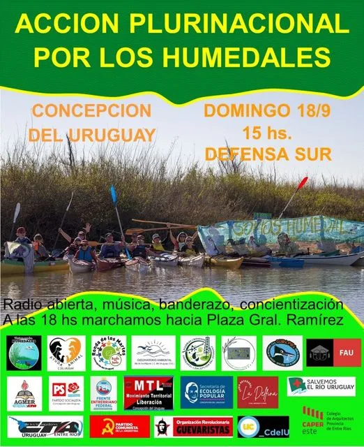 Adhieren en nuestra ciudad: AGMER, Asamblea Ciudadana Ambiental Concepción del Uruguay, Ayuda animal., Caminata Aventura, Canotaje club Regatas Uruguay, CAPER Colegio de arquitectos regional este, Club Parque Sur, COA Güira Pira, CTA Uruguay, Facultad de arquitectura y urbanismo UCU., Feria la Delfina, Frente entrerriano Federal, La Cámpora C del U, MTL, Observatorio ambiental, Organización revolucionaria Guevarista, Secretaria de Ecología Movimiento Evita C del U, Partido comunista, Partido socialista C del U, Ronda de los martes, Salvemos el río Uruguay, Unión ciudadana C del U, Vecinos por los humedales del rio Urugua