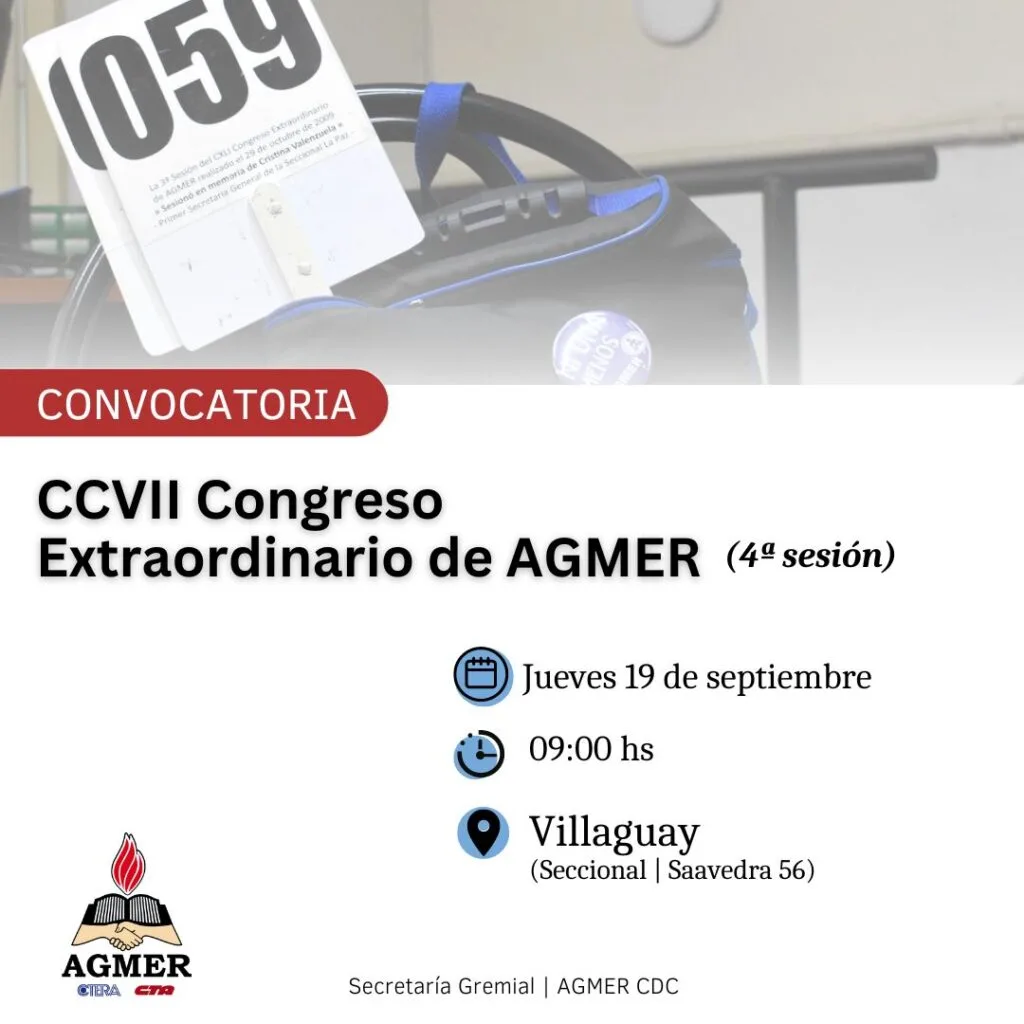 La Comisión Directiva Central de la Asociación Gremial del Magisterio de Entre Ríos (AGMER) convoca a la cuarta sesión del CCVII Congreso Extraordinario, para el jueves 19 de septiembre del corriente año, con modalidad presencial, en el salón de Seccional departamental de AGMER sita en calle Saavedra 56 de la ciudad de VILLAGUAY, a las 9.00 hs, para dar tratamiento al siguiente temario: