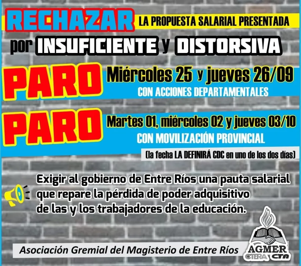 El congreso del principal sindicato docente de la provincia de Entre Ríos AGMER, reunido enla ciudad de Villaguay, rechazó la propuesta salarial del gobierno