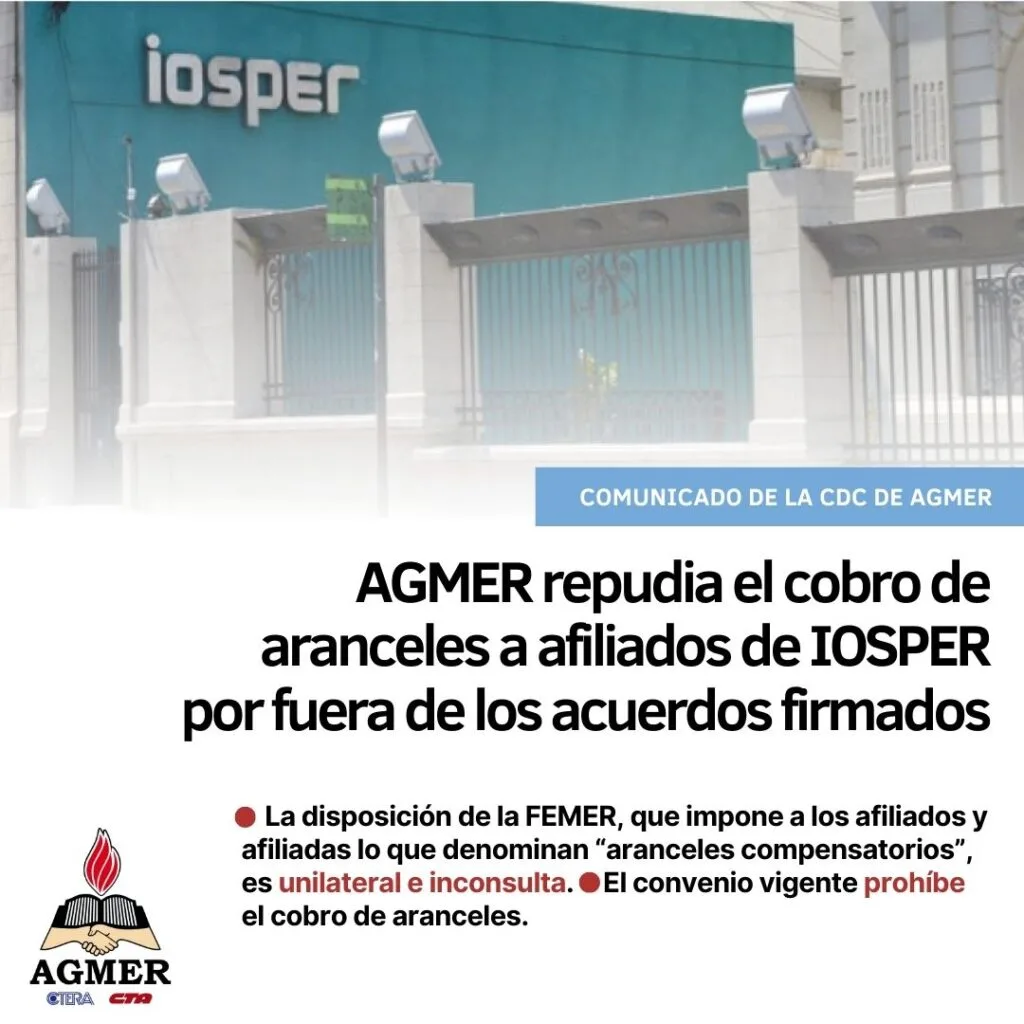 La Asociación Gremial del Magisterio de Entre Ríos (AGMER) manifiesta su repudio a la disposición que lleva a cabo la Federación Médica de Entre Ríos (FEMER) hacia los afiliados y afiliadas del IOSPER, imponiendo un cobro al que han denominado “aranceles compensatorios” y que intenta obligar a afiliados/as a nuestra obra social a pagar esas sumas, de manera absolutamente unilateral e inconsulta.