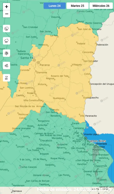 El organismo nacional extendió además una segunda alerta para el martes y miércoles en la madrugada, que afectará específicamente a los departamentos de Colón, Gualeguaychú, Islas del Ibicuy, Tala, Uruguay, Gualeguay y Victoria.