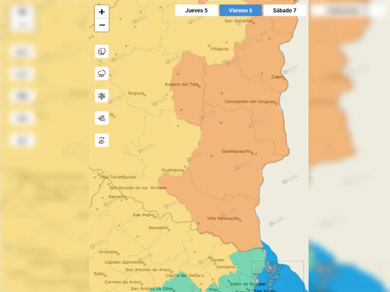 El Servicio Meteorológico Nacional (SMN) emitió un alerta para el viernes 06 de diciembre debido a la formación de tormentas fuertes que afectarán varias regiones de la provincia. La alerta se divide en dos niveles: naranja y amarillo, con condiciones climáticas severas y peligrosas en algunas áreas.