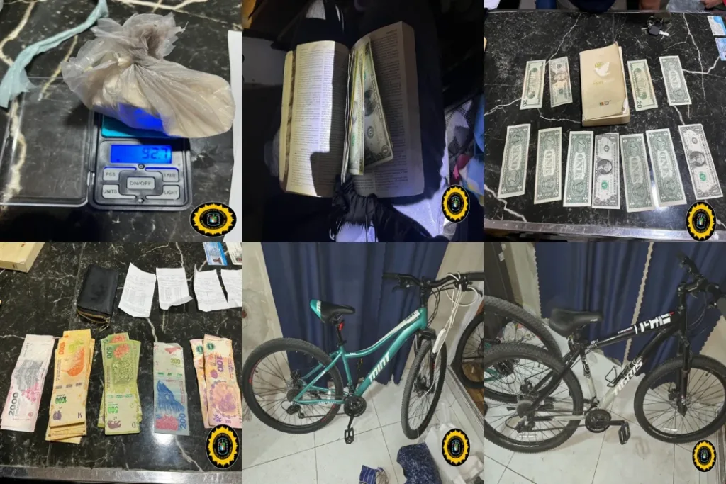En el lugar, además, se incautaron casi dos millones de pesos en efectivo, moneda extranjera, teléfonos celulares, una balanza con restos de sustancia, una picana eléctrica y distintos materiales vinculados a la actividad investigada.