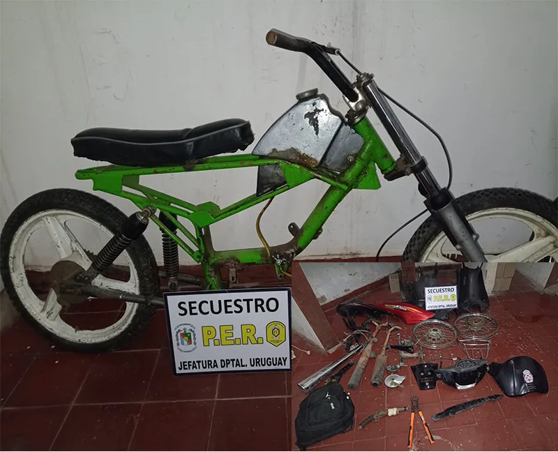 El mismo se efectúa mediante mandamiento emitido por el juzgado de Garantías local a cargo de la Dra. Alejandrina Herrero y tramitada por la fiscal Dra. Lara Plescia. Allí tras notificar a su moradora de 24 años de edad, pareja del encartado, se realiza el formal secuestro de elementos de interés para la causa, entre ellos varias partes plásticas y mecánicas de motovehículo, herramientas y un cuadro de motocicleta de armado casero. Así también se incautó un arma de fuego tipo pistolón.