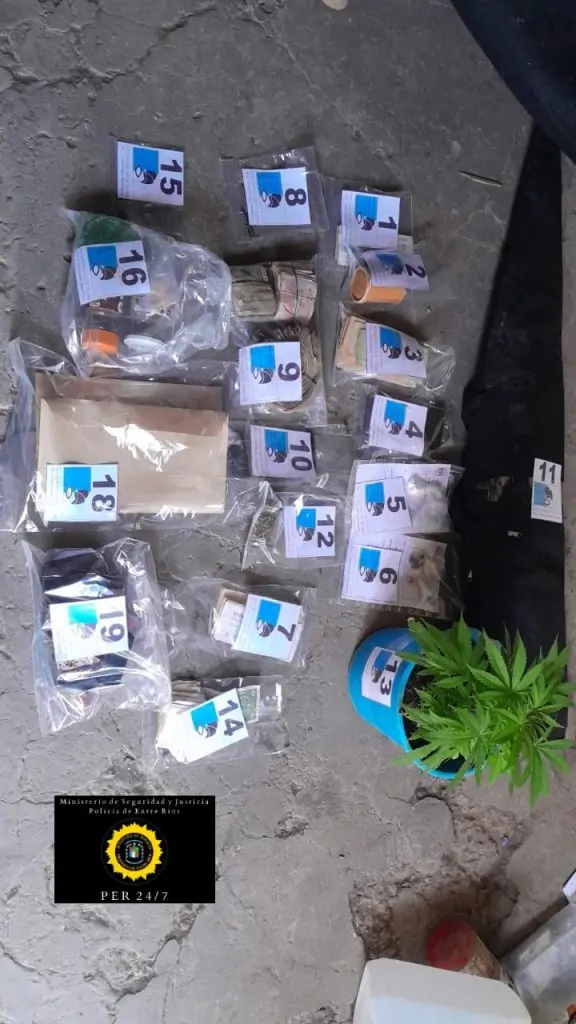 Las investigaciones revelaron la presunta comercialización de sustancias estupefacientes al menudeo. Durante los allanamientos se incautaron varias evidencias clave, entre ellas clorhidrato de cocaína, marihuana, 20 plantas de Cannabis Sativa, más de $1.157.000 en efectivo, elementos para el fraccionamiento de drogas, un arma de fuego con municiones, teléfonos móviles, y dos motocicletas.