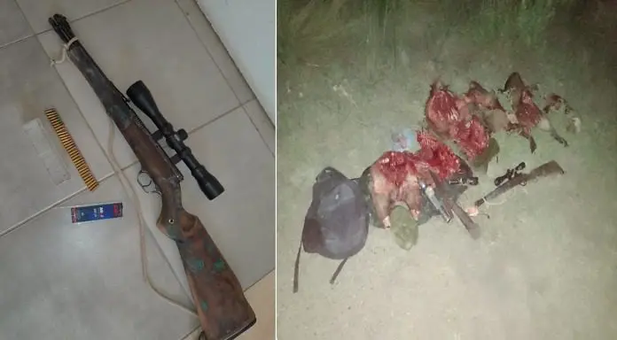 En horas de la madrugada de este martes, personal policial es alertado por escucha de detonaciones en campos zona Arroyo Molino, es que el personal de la brigada, logra luego de recorrer los campos, localizar en la costa norte de dicho arroyo a dos masculinos, mayores de edad quienes se encontraban faenando tres carpinchos, teniendo en su poder un arma de fuego tipo carabina calibre 22, la cual se encontraba lista para ser usada con cartucho en recamara, sin contar con la documentación legal para la tenencia de la misma, además carecían de autorización del dueño del campo para ejercer tal actividad, la cual y en esa especie está prohibida por Resolución 237/79.