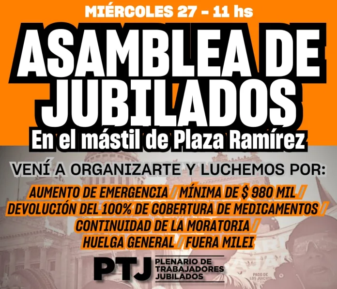 El Plenario de Trabajadores Jubilados invita a una asamblea pública y abierta en el mástil de Plaza Ramírez para este miércoles 27 de noviembre a las 11 hs.