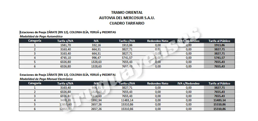 De acuerdo a lo indicado, la actualización también alcanza a estaciones ubicadas en la Ruta Nacional 12 y el corredor oriental, incluyendo los peajes de Zárate, Colonia Elía, Yeruá y Piedritas.