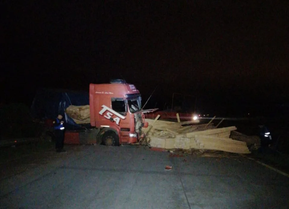 En la madrugada de hoy, en el kilómetro 158 de la Autovía José Gervasio Artigas, se produjo un accidente de tránsito involucrando a un camión marca Renault, modelo 440K, que transportaba madera en un semirremolque. Este rodado era conducido por un joven de 26 años, era acompañado por un masculino de 48 años, ambos residentes en la provincia de Misiones.