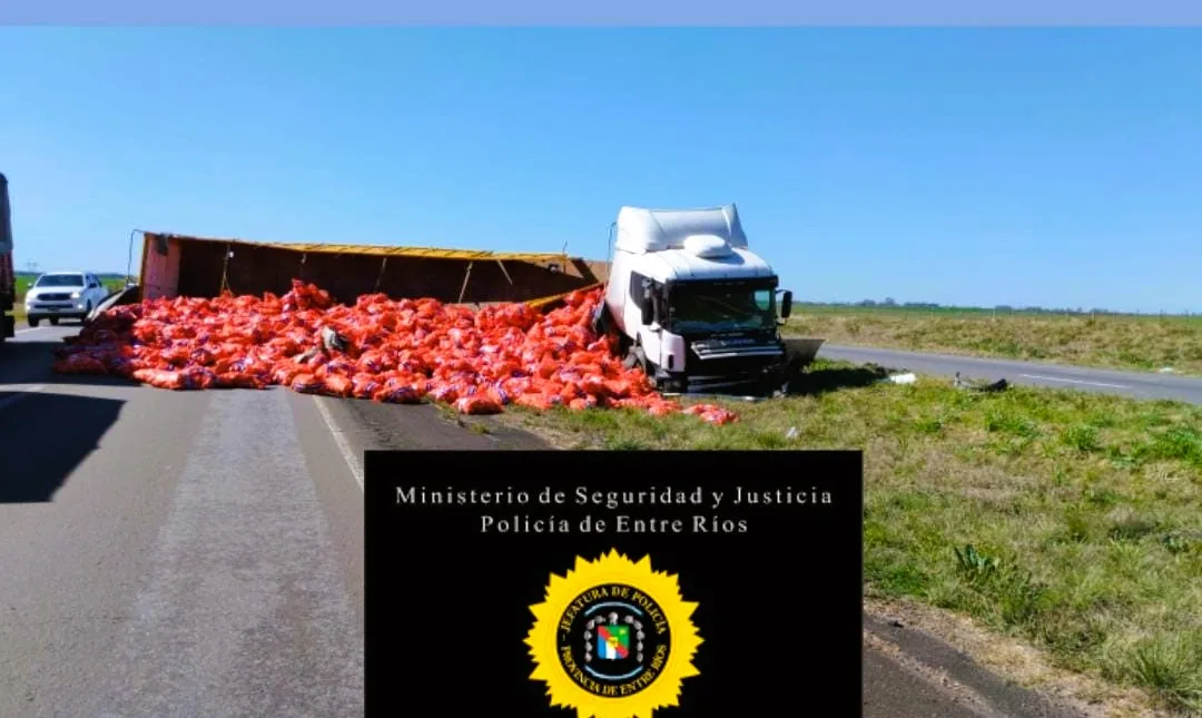 Esta tarde, alrededor de las 14:30 horas, se registró un siniestro vial en la Autovía Artigas, a la altura del kilómetro 97, que involucró a un camión cargado de bolsas de cebolla y a un automóvil particular. Afortunadamente, el incidente no dejó personas lesionadas.