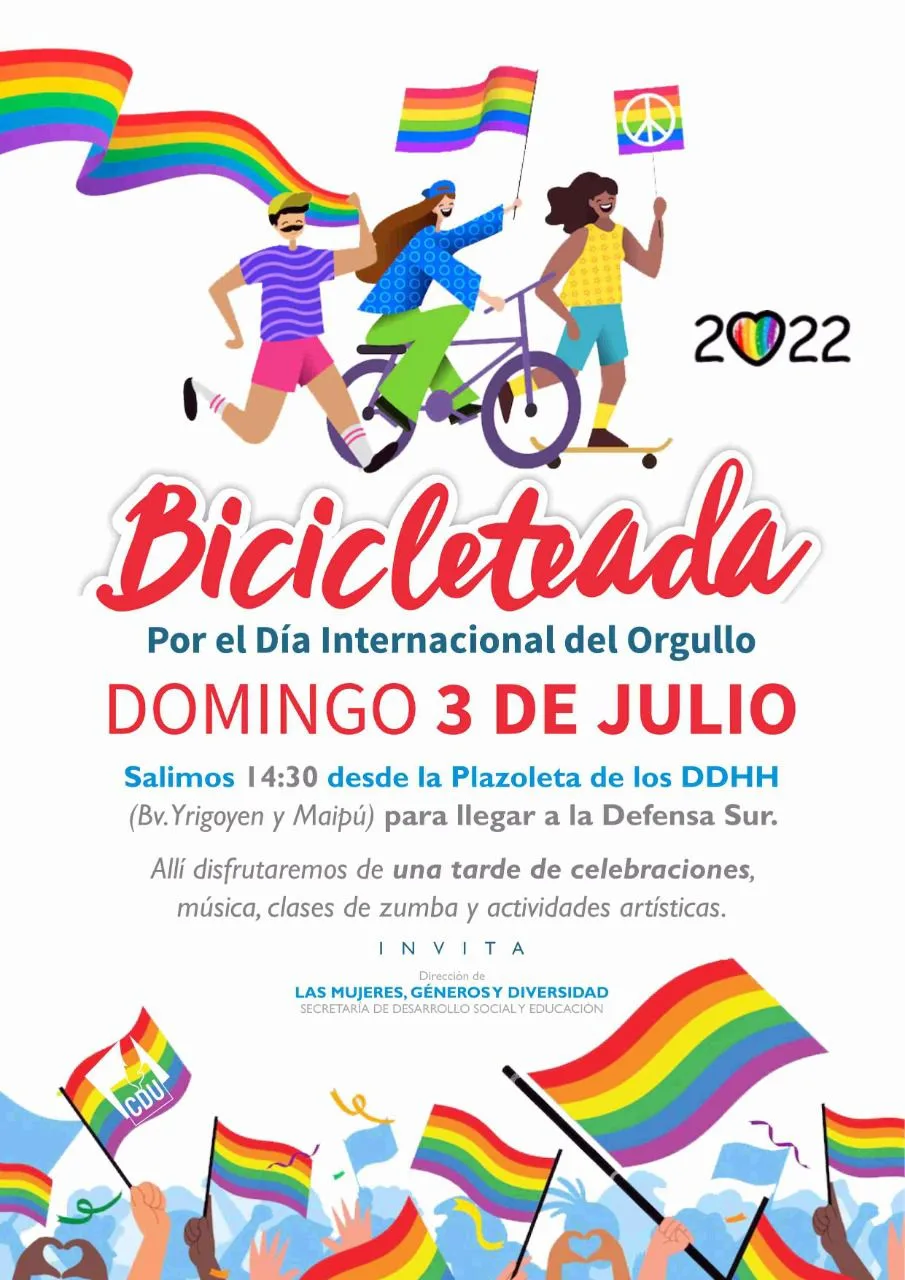 Continúa la agenda enmarcada en el Día Internacional del Orgullo, celebrado el 28 de junio. Será con una bicicleteada que se realizará este domingo, saliendo a las 14.30 desde la Plazoleta de los Derechos Humanos, siguiendo un recorrido que finalizará en la Defensa Sur. Allí se disfrutará de una tarde de celebraciones, música, clases de zumba y demás actividades artísticas. Invita a esta actividad la Dirección de las Mujeres, Géneros y Diversidad.
