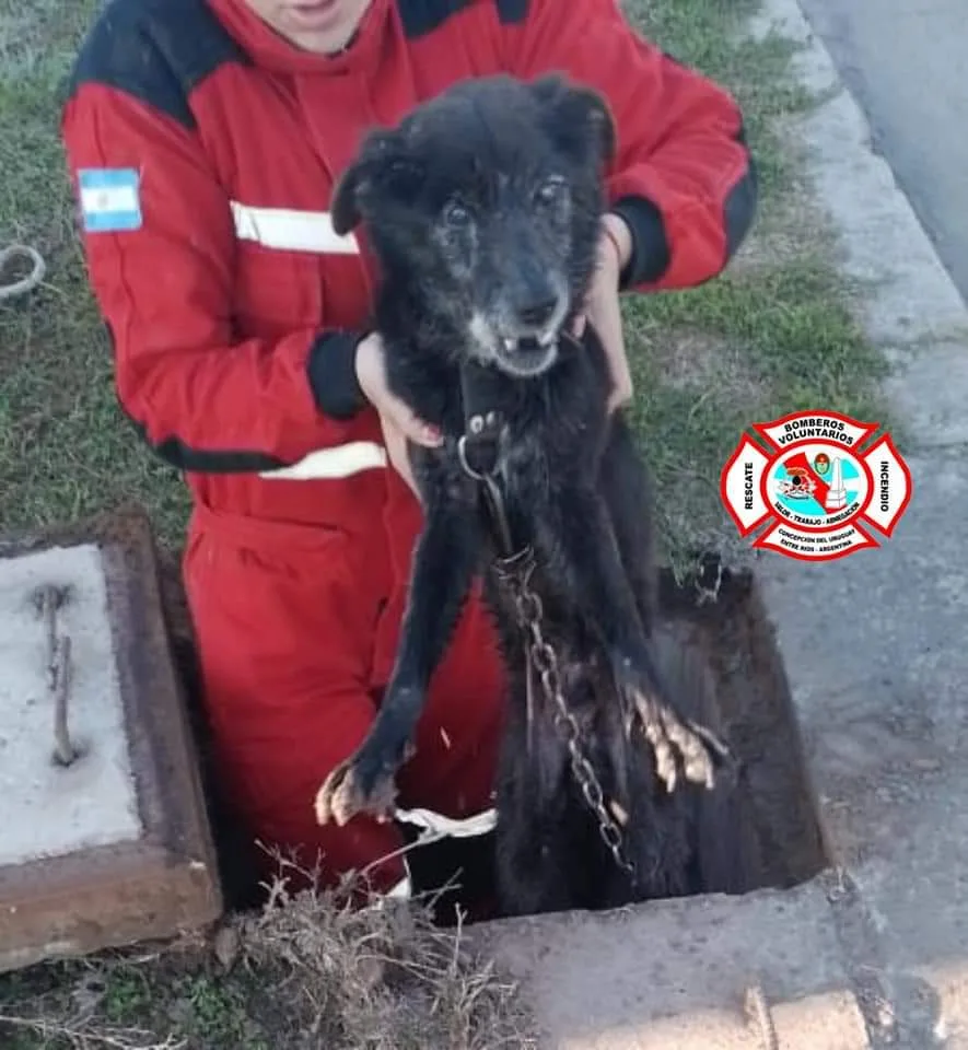 Esta mañana a las 07:50 hora bomberos son alertados sobre un perro que se encontraba atrapado en una alcantarilla en Contador Rubinsky y Acceso Norte General Mosconi.
