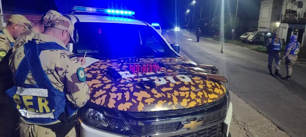 En el primer operativo del sábado por la noche, se detuvo un automóvil Volkswagen Golf rojo en la Ruta 20 acceso a Gualeguaychú, con cuatro ciudadanos del Tiro Federal transportando dos escopetas calibre 12, acompañadas de cartuchería. Simultáneamente, en la misma acción, se detuvo un automóvil Renault 18 en el que se encontraba un ciudadano de Concepción del Uruguay, quien llevaba un pistolón calibre .22 sin documentación.