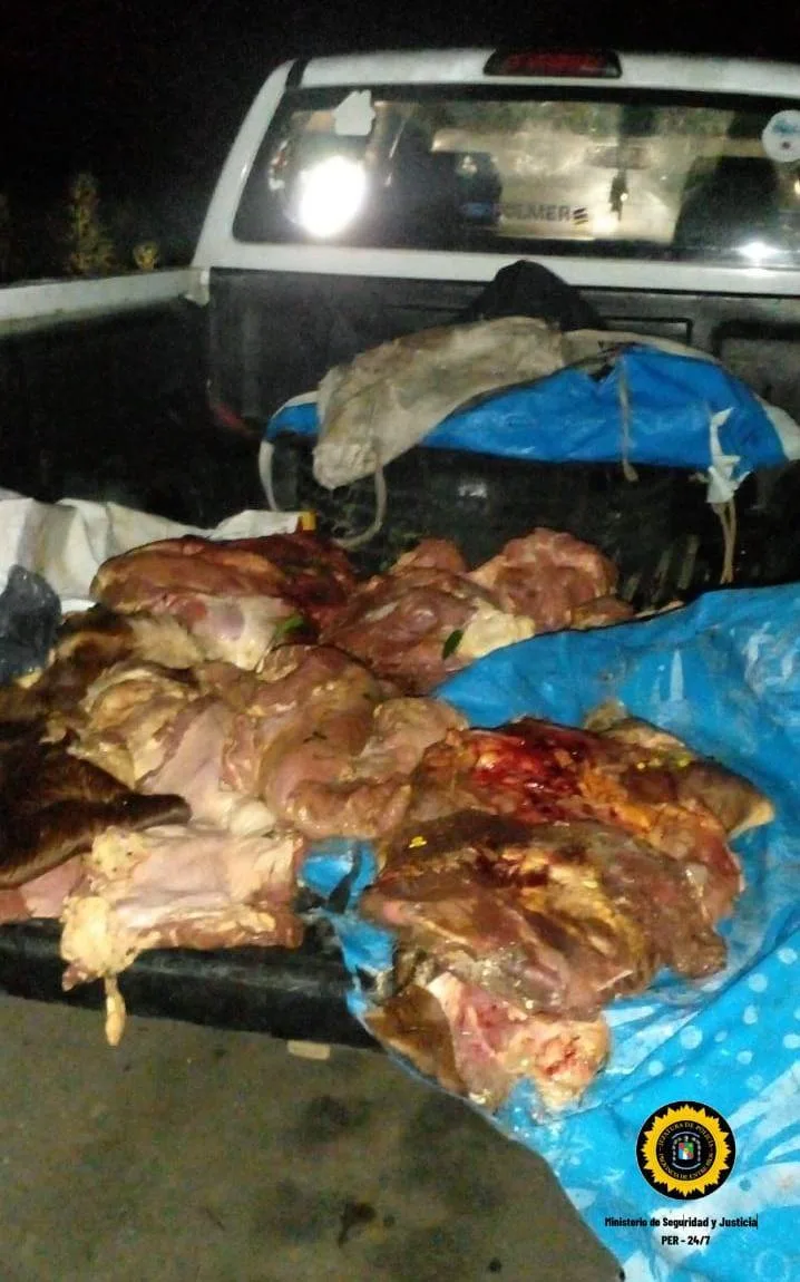 En la caja del vehículo se encontraron bolsones con cortes de carne en descomposición y, en el habitáculo, dos armas de fuego: una escopeta calibre 12 y un rifle calibre .22, ambas sin documentación. La Dra. Dropsi Virginia, fiscal en turno, ordenó el secuestro de las armas y la carne. Los detenidos fueron llevados a la Jefatura de Policía para su identificación y, tras ser examinados, recuperaron la libertad.