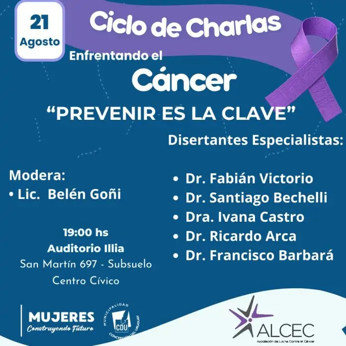 Continúa el ciclo de charlas “Enfrentando el Cáncer”, que lleva adelante el Programa “Mujeres Construyendo Futuro”. En tal marco, el miércoles 21 de agosto se realizará la charla «Prevenir es la clave», desde las 19 en el Auditorio “Arturo Illia”, con entrada libre. Esta charla es organizada por Mujeres Construyendo Futuro junto a la Asociación de Lucha Contra el Cáncer (ALCEC), con apoyo de la Municipalidad.