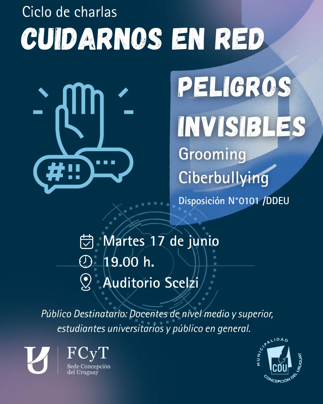 La Municipalidad de Concepción del Uruguay, en articulación con la Facultad de Ciencia y Tecnología de UADER, realizará la charla “Peligros invisibles: grooming y ciberbullying”, este martes 17 de junio a las 19 horas en el Auditorio Municipal “Carlos María Scelzi”.