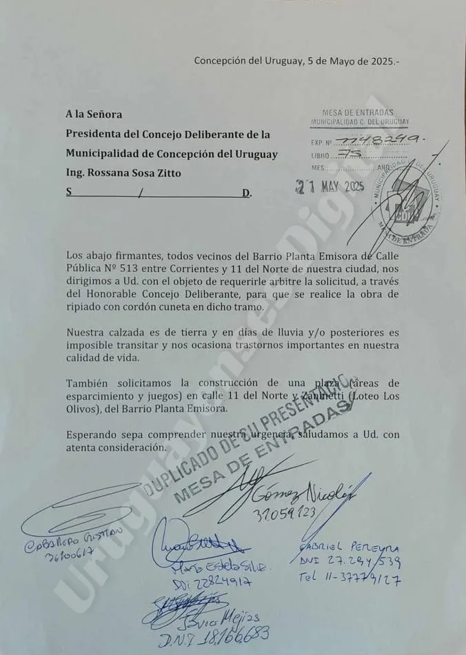 Ante esta problemática, los residentes indicaron que realizaron un pedido formal mediante nota dirigida al Intendente y a la Viceintendenta, solicitando la reparación de la calle y la correspondiente señalización. Sin embargo, aseguran que, pese al paso del tiempo, no han recibido respuestas ni soluciones concretas.