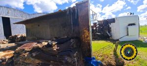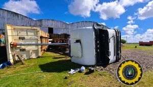 Cerca del mediodía, un camión de la empresa de transporte “3 Hermanos” volcó mientras descargaba cuero vacuno en una empresa ubicada en el kilómetro 211 de la ex Ruta 18.