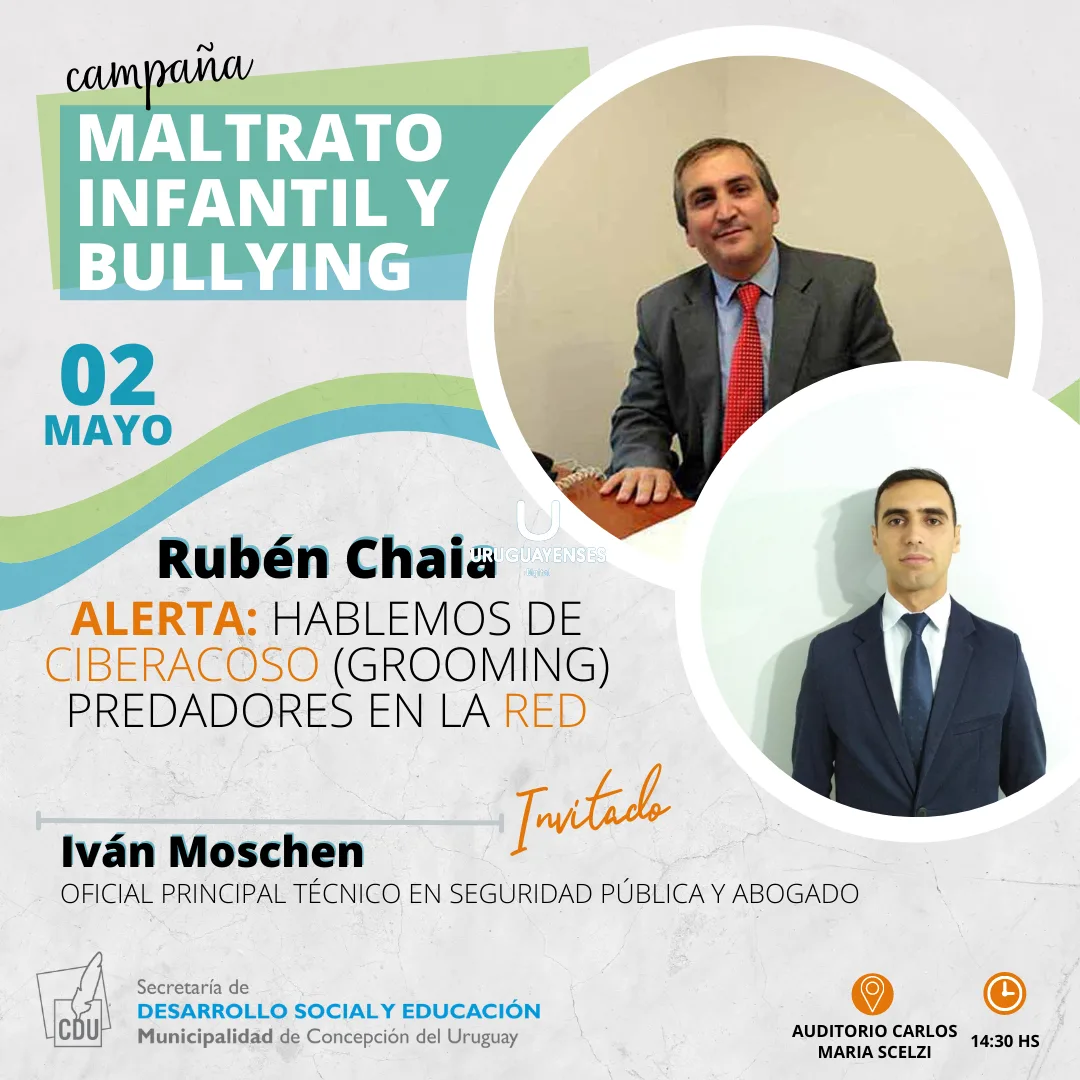 Este 02 de mayo a las 14,30 hs en el Auditorio Carlos María Scelzi, se realizara una charla sobre “Maltrato Infantil y Bullying” con la participación de Rubén Chai y como invitado el Oficial Principal Técnico en seguridad pública y Abogado Iván Moschen