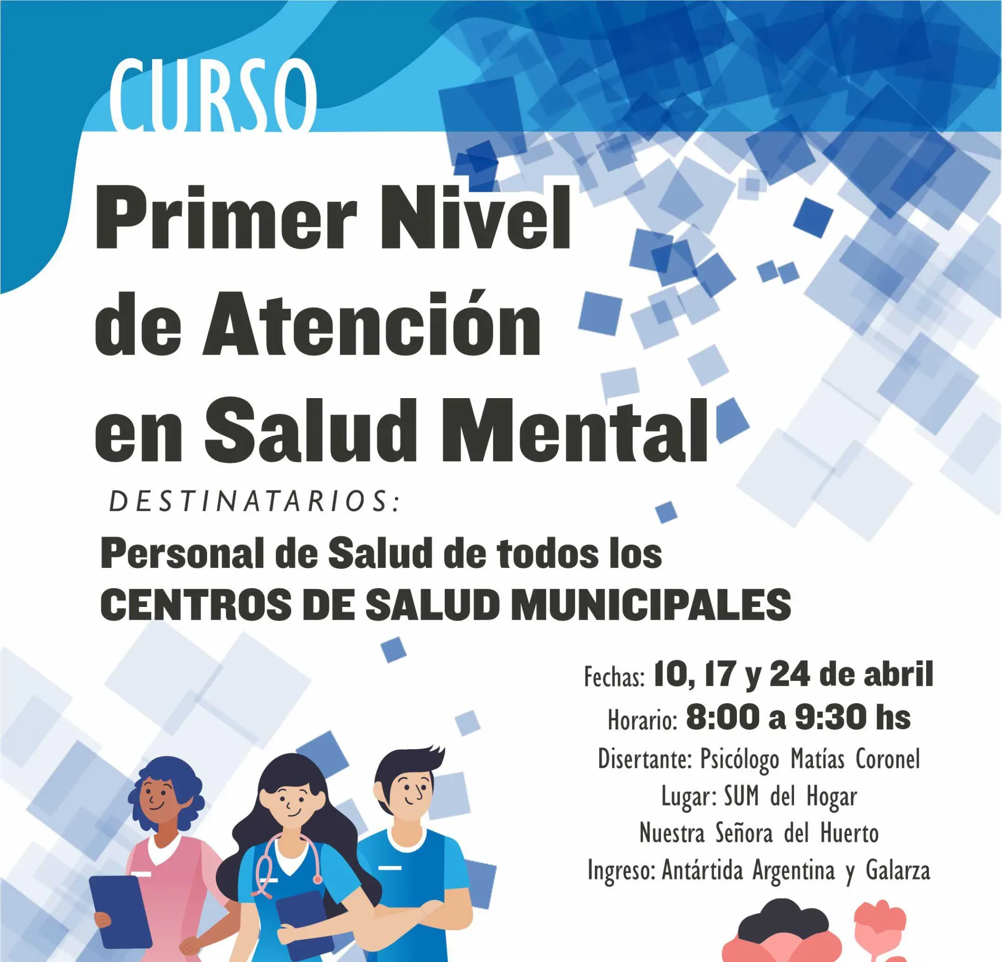 El curso, denominado “Primer nivel de atención en salud mental”, será dictado por el psicólogo Matías Coronel y se desarrollará en tres encuentros programados para los días 10, 17 y 24 de abril, de 8 a 9.30 horas, en el SUM del Hogar “Nuestra Señora del Huerto”.