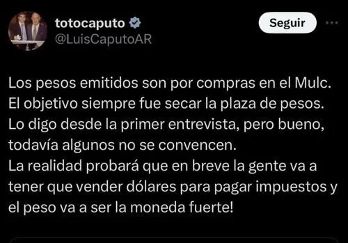 «Los pesos emitidos son por compras en el Mulc. El objetivo siempre fue secar la plaza de pesos. Lo digo desde la primer entrevista, pero bueno, todavía algunos no se convencen. La realidad probará que en breve la gente va a tener que vender dólares para pagar impuestos y el peso va a ser la moneda fuerte!», escribió el ministro.
