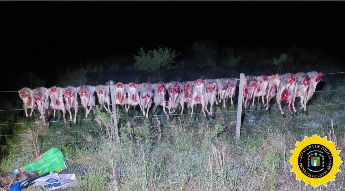 En plena recorrida preventiva, los agentes detectaron un vehículo detenido a la vera del camino. Al inspeccionar la zona, hallaron 35 vizcachas (Lagostomus maximus) muertas y evisceradas, colgadas en un alambrado, evidenciando una caza masiva y depredadora de esta especie autóctona, cuya captura está prohibida por ley.