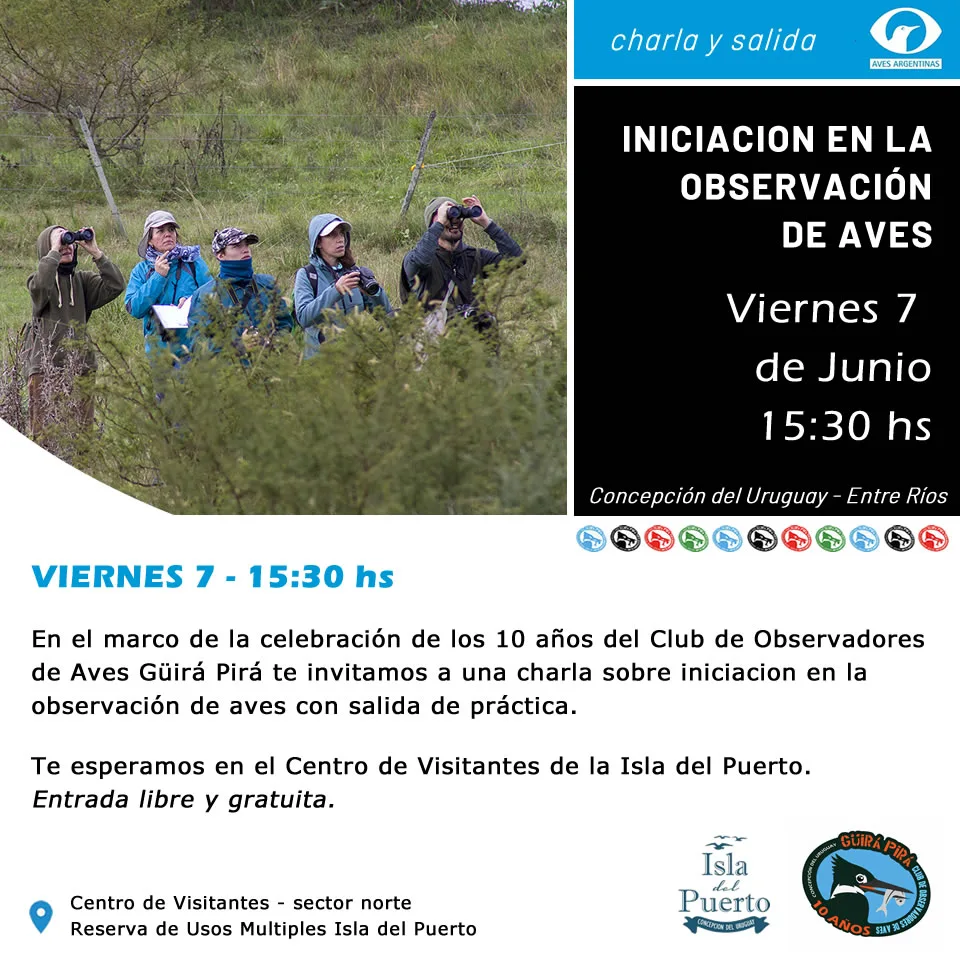 En el marco de las actividades que está realizando el Club de Observadores de Aves (COA) Güirá Pirá por la celebración de sus 10 años de vida y en la semana del día mundial del ambiente, se realizará este viernes a partir de las 15,30 horas una charla sobre inició en la observación de aves y una posterior salida de práctica en la Reserva de Usos Múltiples Isla del Puerto.