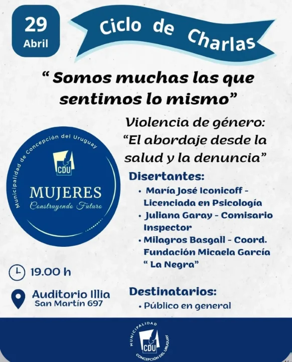 La actividad contará con la participación de las profesionales: María José Iconicoff, licenciada en Psicología; Juliana Garay, comisario inspector; y Milagros Basgall, coordinadora de la Fundación Micaela García “La Negra”.