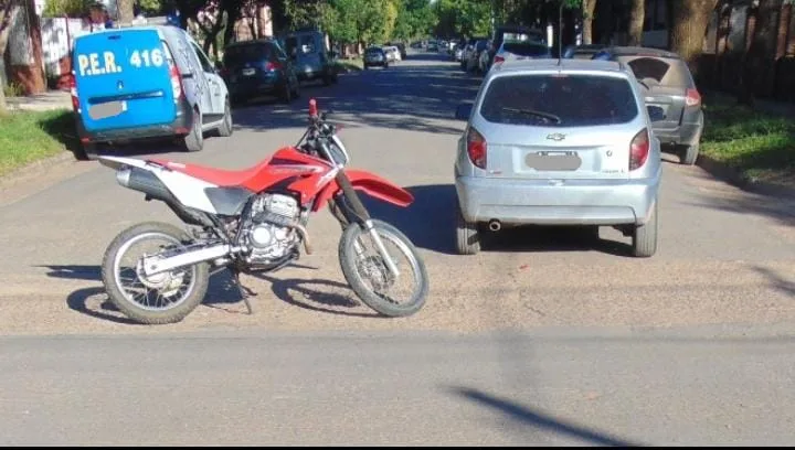 En horas de la tarde del día martes, personal policial intervino en un Accidente de Tránsito en intersección de calles Paso de Los Andes y Sourigues, protagonizado por una Motocicleta marca Honda, modelo XR 250, conducida por un masculino de 52 de edad y un automóvil marca Chevrolet modelo Celta guiado por una femenina de 32 años de edad, el conductor del menor rodado resultó con Lesiones de carácter leves.