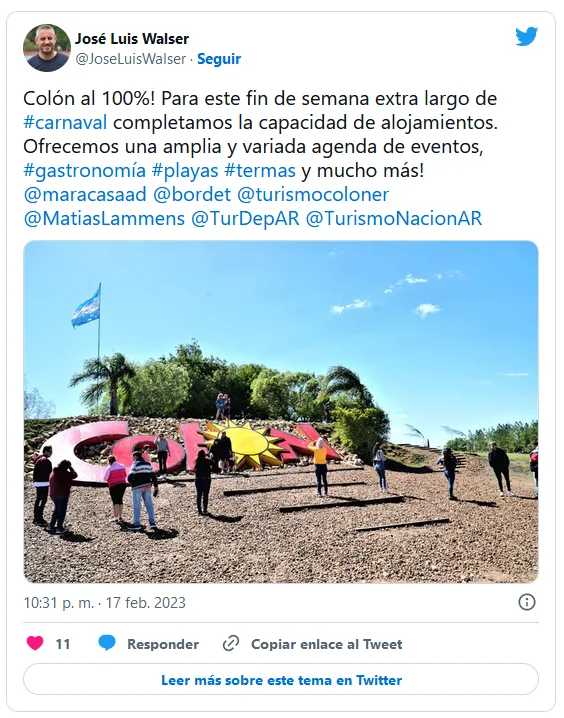 Al recorrer los trabajos de puesta en valor del clásico cartel de acceso a la Ciudad, elegido por miles de turistas para la clásica foto de recuerdo de Colón, el Intendente José Luis Walser expresó: “compartimos un poco con las familias y visitantes que nos eligen, quiero aprovechar también para agradecerles porque en este fin de semana de carnaval Colón está nuevamente al 100 por ciento” dijo el Intendente.