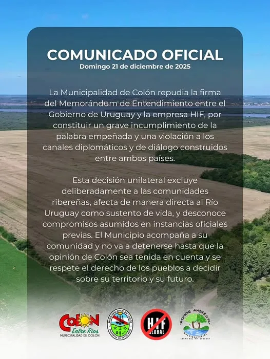 La Municipalidad de Colón manifestó su enérgico repudio a la firma del Memorándum de Entendimiento entre el Gobierno de la República Oriental del Uruguay y la empresa HIF, al considerar que se trata de una decisión unilateral que incumple compromisos asumidos previamente y vulnera los canales de diálogo y entendimiento construidos entre ambos países.