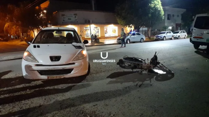 En la tarde de la víspera personal policial intervino en accidente de tránsito ocurrido en Avenida Urquiza y Monteagudo, protagonizado por un automóvil, marca Peugeot, modelo 207, conducido por una ciudadana de 33 años de edad, domiciliada en nuestra ciudad, quien circulaba por la Avenida antes mencionada en sentido de Este a Oeste y cuando llega a la intersección de calle Monteagudo, por causas a establecer, colisiona con una motocicleta, marca Corven, modelo Energy, conducida por un joven, de 30 años de edad, quien circulaba por la misma avenida en sentido de Oeste a Este. El conductor de la moto fue trasladado por emergencias médicas al hospital San Benjamín, examinado por médico de turno, resultó con lesiones leves. Se iniciaron Actuaciones Simples policiales.-