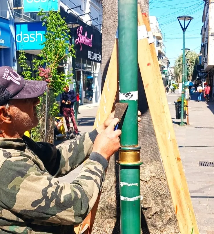 Actualmente se encuentran trabajando en similar tarea a la ya realizada en la plaza, pero en las columnas de las farolas de la peatonal Rocamora algo solicitado por los vecinos y trabajadores del principal paseo comercial de la ciudad. Los trabajos se iniciaron desde la esquina con calle Eva Perón, y se continuará hacia el oeste. En todos los casos se insiste hacia la comunidad, en el pedido de cuidar las columnas recuperadas, para que no vuelvan a pegar nada y la peatonal vaya recuperando su brillo, armonía y estética.