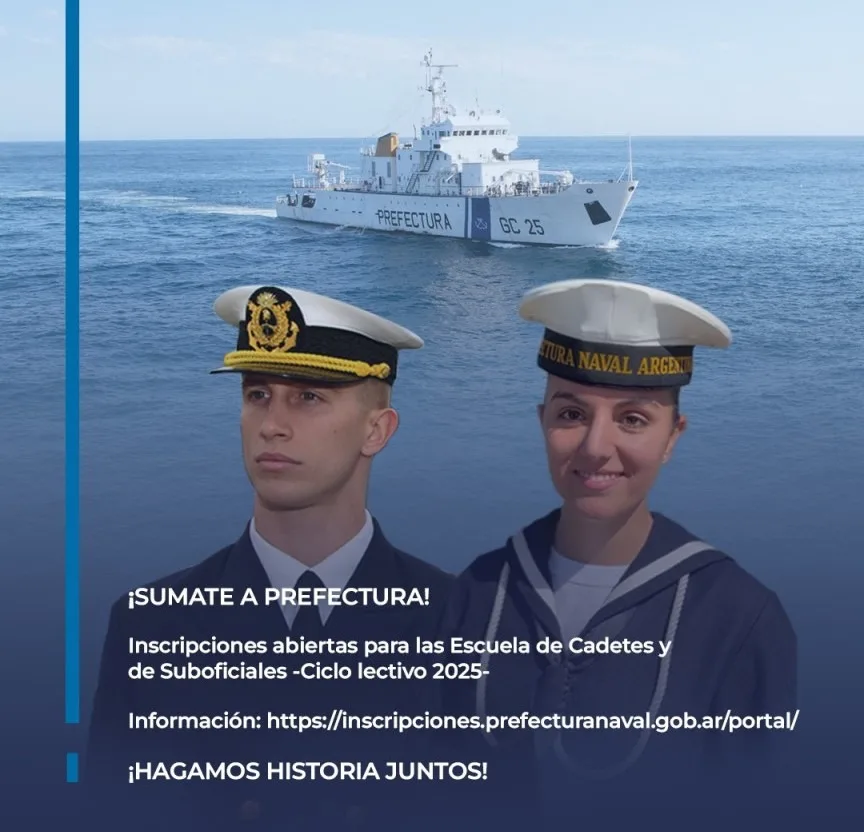 La Prefectura Naval Argentina abrió la inscripción a sus Escuelas de Oficiales y Suboficiales para los jóvenes, de ambos sexos, que quieran desarrollar su carrera profesional como oficiales y suboficiales del equipo de la Autoridad Marítima argentina, pudiendo acceder a un título universitario (tras una pasantía en el campo de estudio) o una tecnicatura.