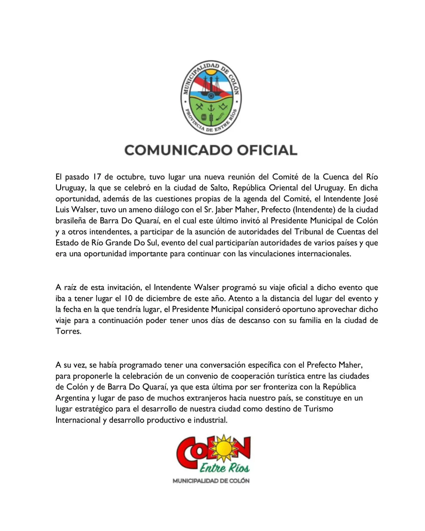 El pasado 17 de octubre se llevó a cabo una reunión del Comité de la Cuenca del Río Uruguay en la ciudad de Salto, República Oriental del Uruguay. Durante el encuentro, el Intendente de Colón, José Luis Walser, mantuvo un diálogo con el Prefecto de Barra Do Quaraí, Sr. Jaber Maher, quien invitó a Walser y a otros intendentes a participar en la asunción de autoridades del Tribunal de Cuentas del Estado de Río Grande Do Sul, programada para el 10 de diciembre.
