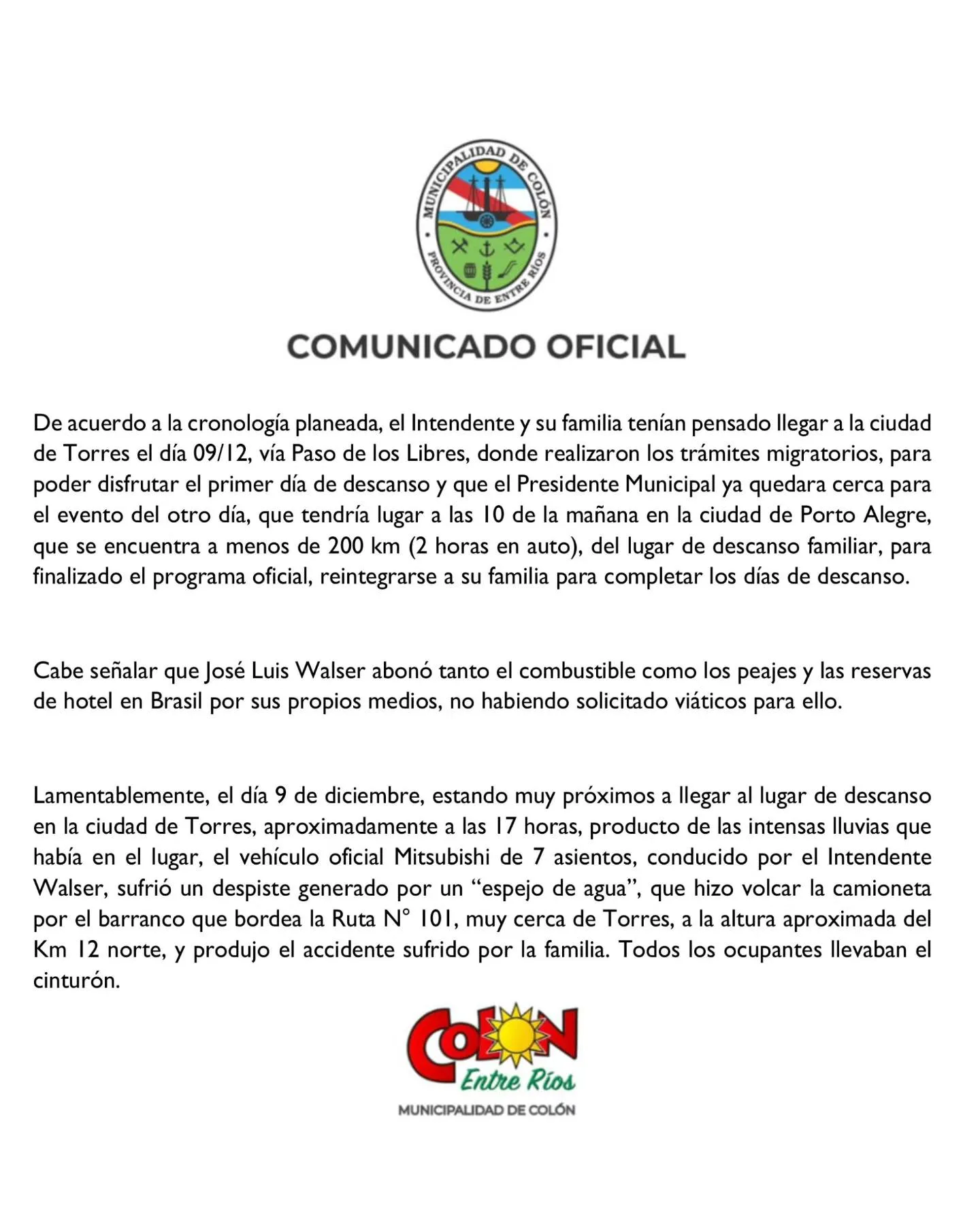 El viaje de la familia Walser incluía la llegada a Torres el 9 de diciembre, vía Paso de los Libres, para completar los trámites migratorios y estar cerca del evento oficial en Porto Alegre, a menos de 200 km de distancia. Todos los gastos de traslado, peajes y alojamiento fueron asumidos por el propio Intendente, sin solicitar viáticos municipales.