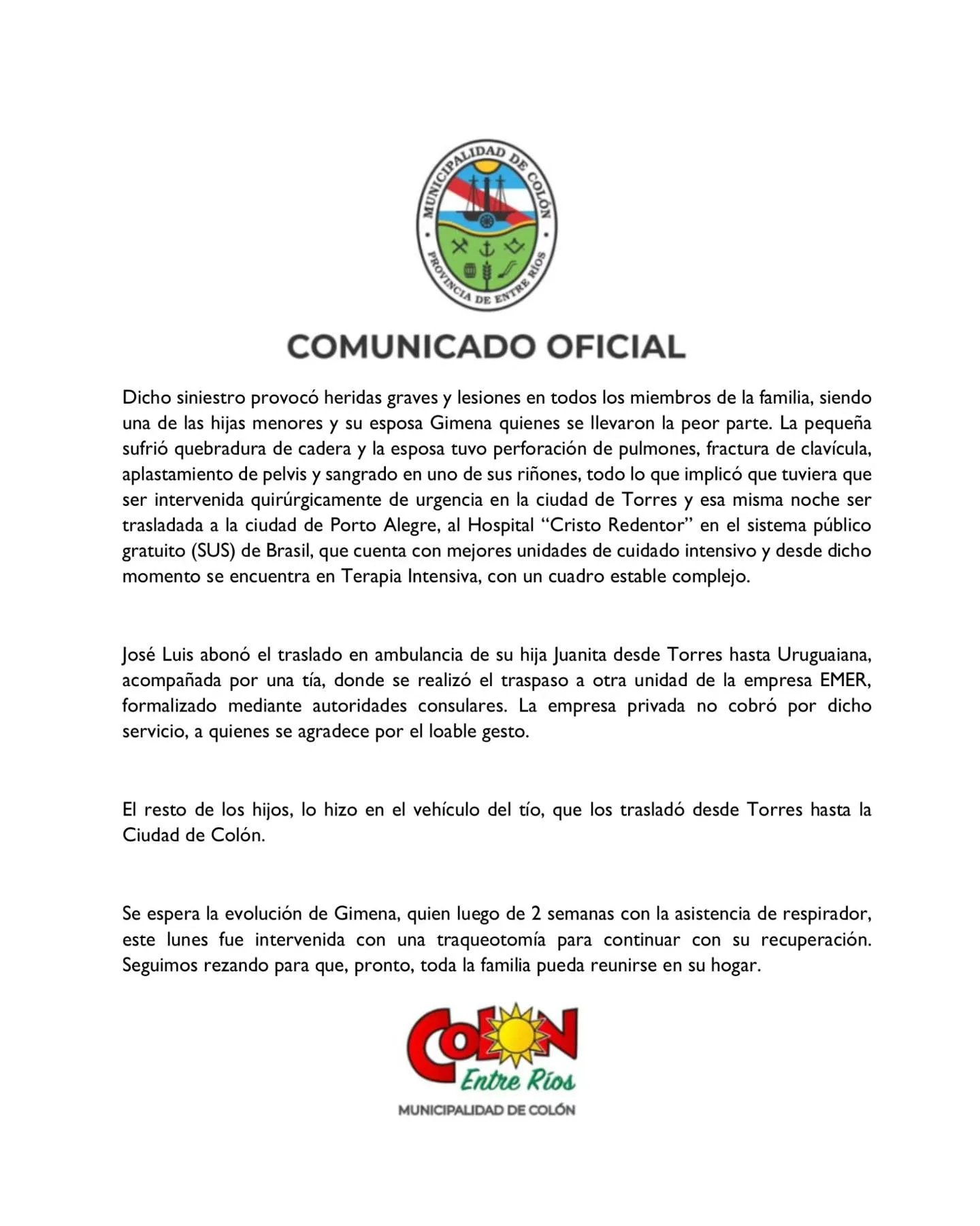 La Municipalidad de Colón informa que Gimena Walser fue sometida a una traqueotomía esta semana como parte de su recuperación y continúa recibiendo atención especializada. La familia y la comunidad esperan su pronta evolución y reunificación en el hogar familiar.