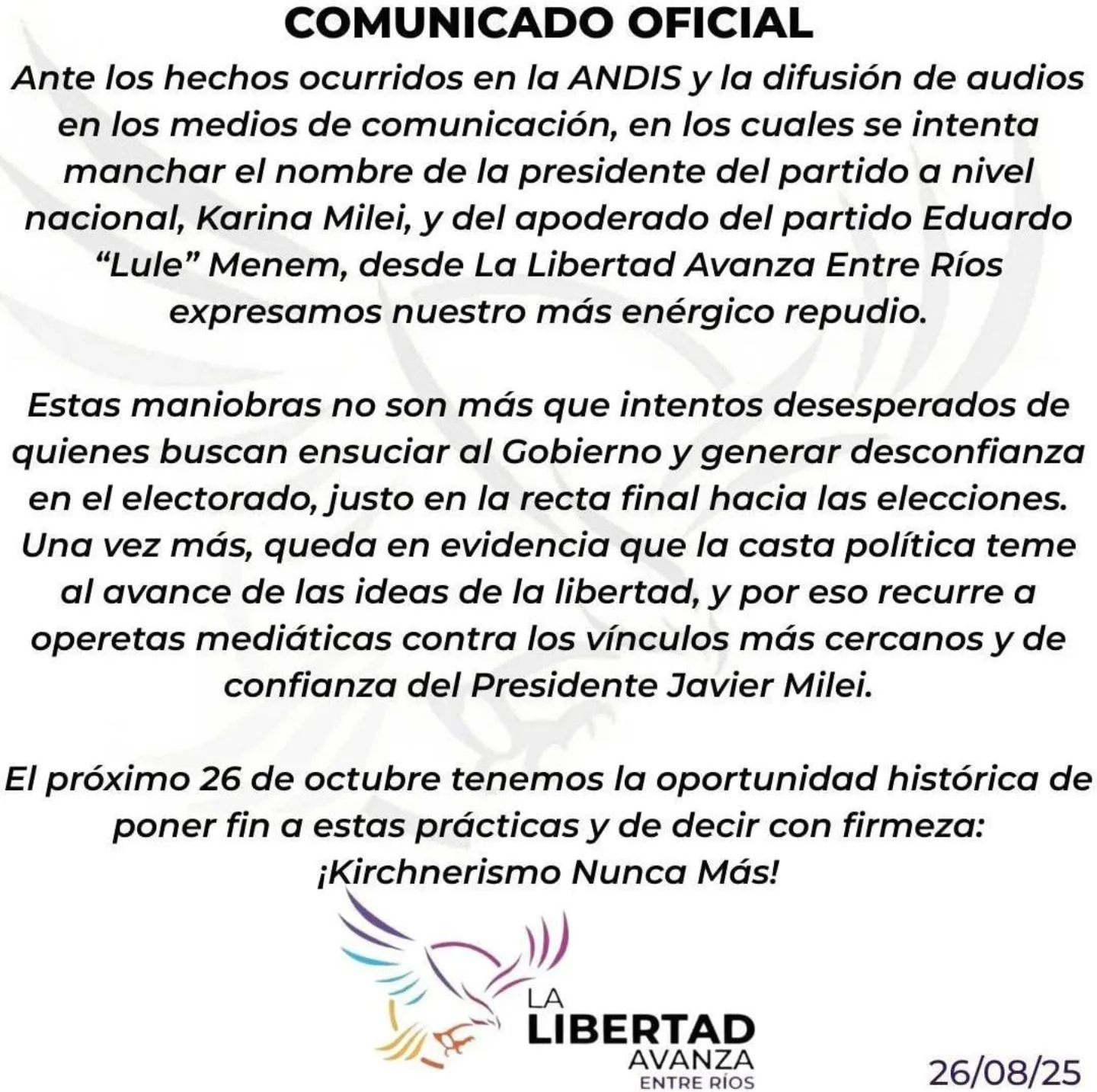 A través de un comunicado oficial, La Libertad Avanza Entre Ríos expresó su «más enérgico repudio» a la difusión de audios vinculados a la Agencia Nacional de Discapacidad (ANDIS) que, según el partido, intentan manchar la imagen de Karina Milei, presidenta del espacio a nivel nacional, y de Eduardo «Lule» Menem, apoderado del partido.