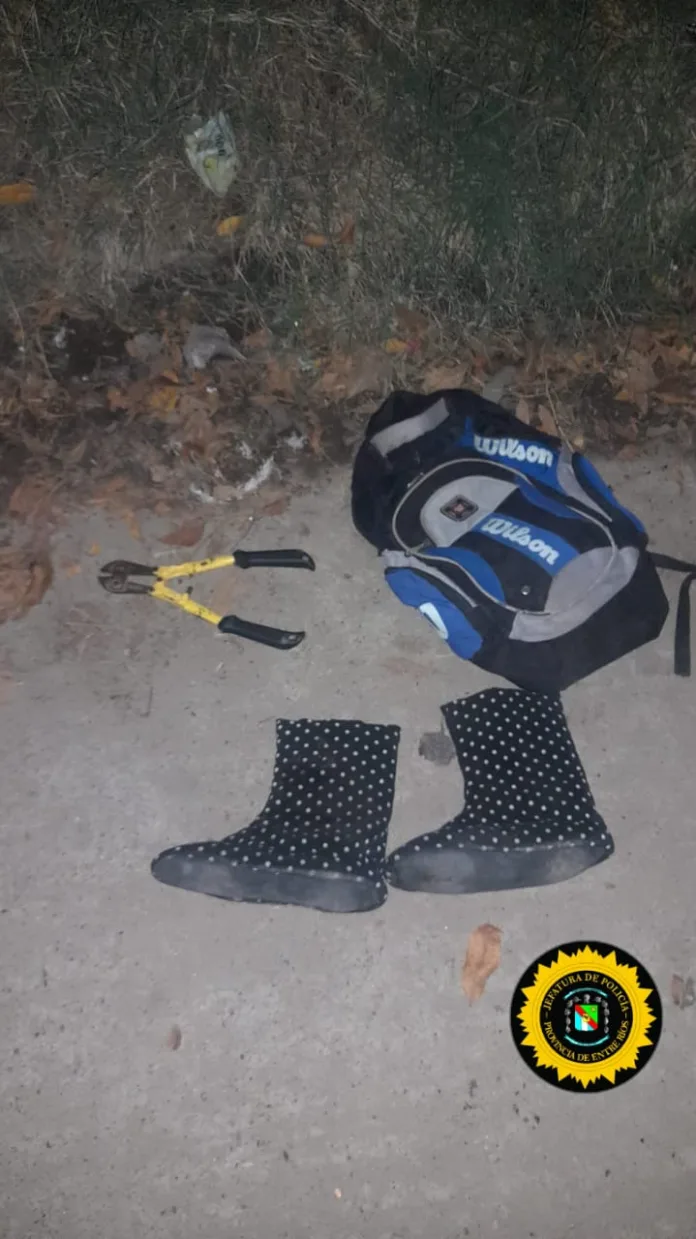 Al notar la presencia policial, el joven intentó huir, pero fue alcanzado y reducido a los pocos metros. Durante la requisa, se le secuestró una tijera corta pernos, un par de botas, ojotas, ropa interior, medias y una mochila en la que se halló un documento de identidad perteneciente a una mujer de 65 años, propietaria del taller violentado.