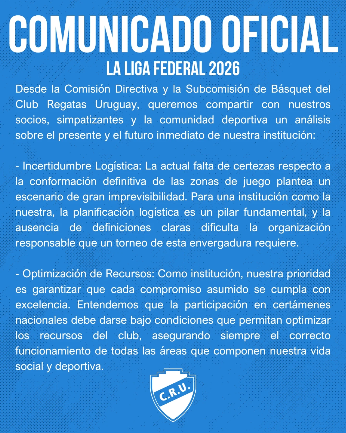 Regatas Uruguay optó por priorizar su estructura, fortalecer el trabajo formativo y concentrar esfuerzos en competencias provinciales y locales. Una elección entendible y responsable desde lo institucional, pero que al mismo tiempo interpela al básquet argentino en su conjunto. Porque cuando clasificar ya no garantiza competir, el problema deja de ser del club y pasa a ser del sistema. (Uruguayenses)