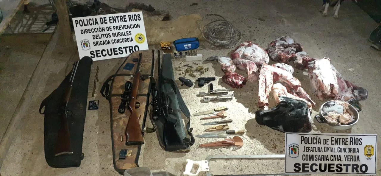 En la tarde de ayer, personal de Comisaría Colonia Yeruá y personal de la Brigada de Prevención de Delito Rurales, en el marco de una investigación en trámite, se dio cumplimiento a una Orden de Allanamiento en un establecimiento de la zona, logrando el Secuestro de varios elementos de interés para la causa que se investiga. Procediendo al Secuestro de un fusil marca Máuser Calibre 308; una carabina calibre 22; un fusil 44 Mágnum; una Pistola Bersa calibre 380; Varios cuchillos con restos de sangre.