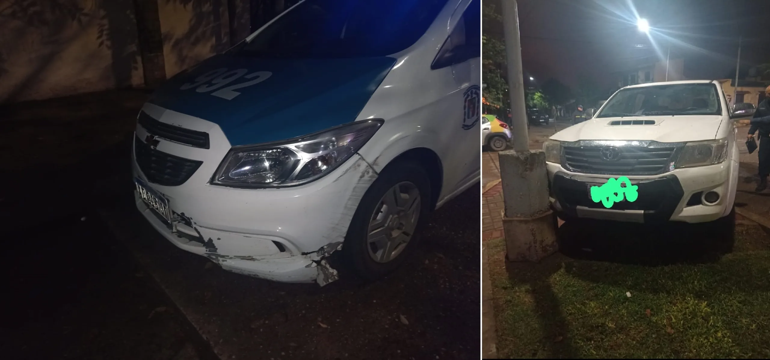 Un móvil policial del comando Radioeléctrico se hizo presente, por un inconveniente con dos masculinos mayores de edad, frente a un local comercial, al retirarse uno de ellos, haciéndolo en una camioneta Toyota Hilux, color blanca, previo circular alrededor de la manzana de la plaza principal, al transitar por calle San Martín, colisiona con el móvil policial allí asignado, provocando daños en el guardabarros y paragolpes delantero, no resultando personal policial lesionado, mientras que este rodado prosiguió con su marcha hacia calle Echague en dirección al Sur.