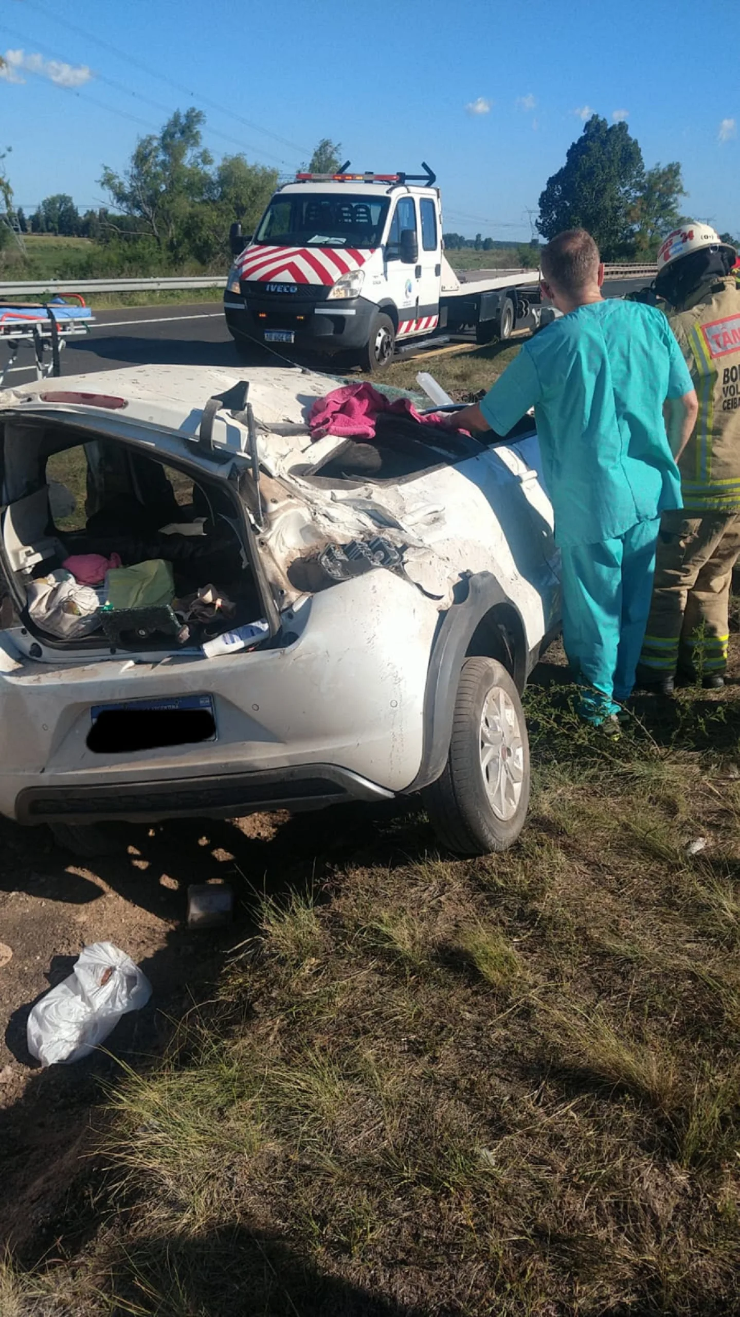 En la siesta de este lunes un nuevo despiste y vuelco en la autovía, promediando las 16.40hs, en Ruta Nacional N° 12 km 121, interviene personal de Comisaria Ceibas en un accidente de tránsito, al llegar al lugar se observó en el cantero central un automóvil Marca Fiat, modelo Mobi, en el cual lamentablemente se encuentra una persona de sexo femenino, en el asiento del acompañante, atrapada, con varias lesiones. Luego se ser extraída por la gran labor de Bomberos voluntarios (Ceibas) la misma fue traslada de urgencia al Hospital de la Localidad de Zarate, para determinar la gravedad de sus lesiones. El conductor del vehículo, una persona de sexo Masculino, de 35 años de edad, domiciliado en la localidad de Pilar, Provincia de Buenos Aires, el cual manifiesta que circulaba de sentido Norte a Sur, debido al sueño, pierde el control del rodado dirigiéndose al cantero central, este ciudadano presento cortes menores y varios golpes, producto del siniestro. Además, se encontraban acompañado por otra persona de sexo masculino de 18 años de edad, quien sufre lesiones afortunadamente, solo en el hombro derecho.