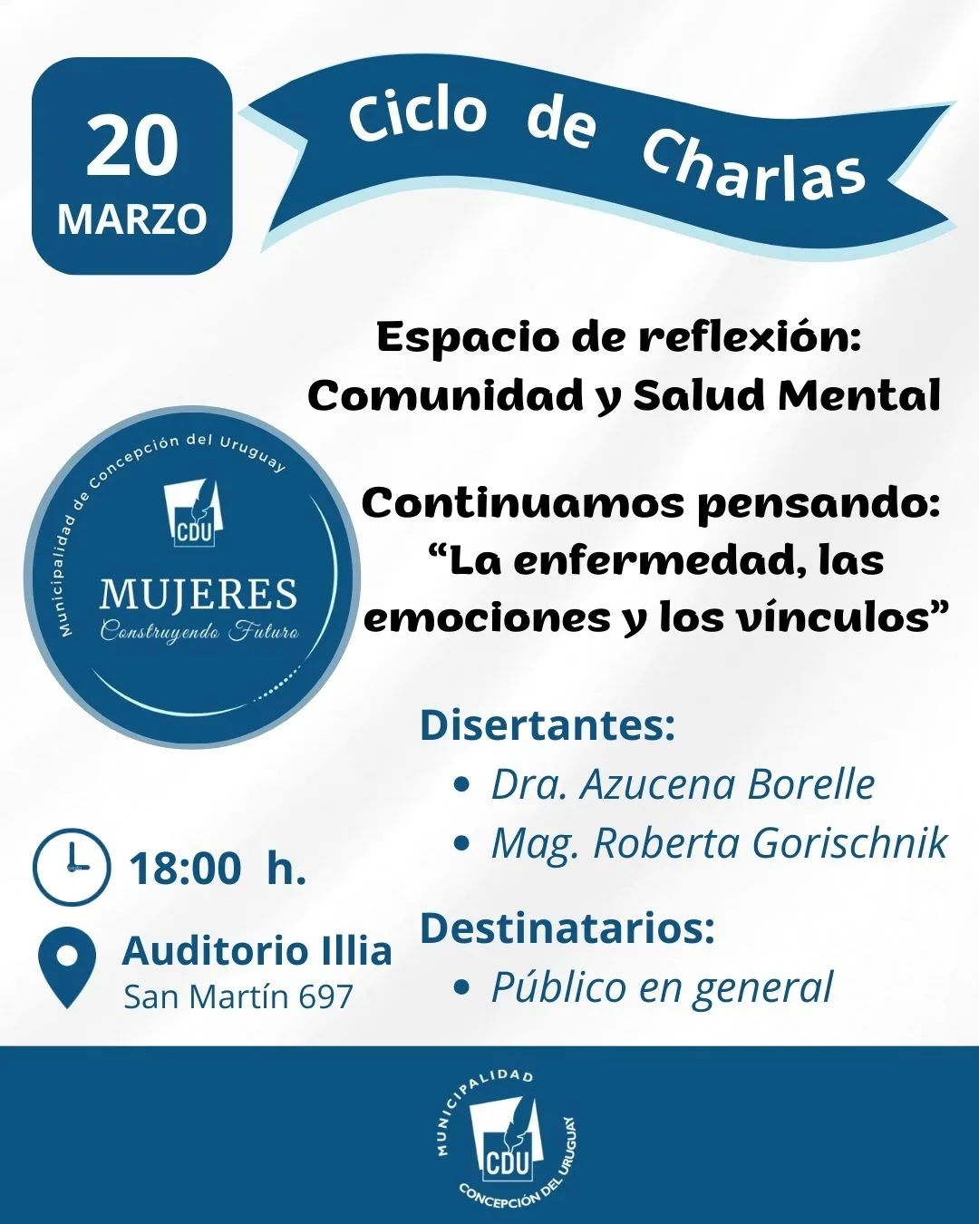 La jornada, que tendrá lugar el viernes 20 de marzo, a las 18 horas, en el Auditorio Illia, ubicado en San Martín 697, subsuelo del Centro Cívico, se desarrollará bajo el lema “Continuamos pensando: la enfermedad, las emociones y los vínculos”.