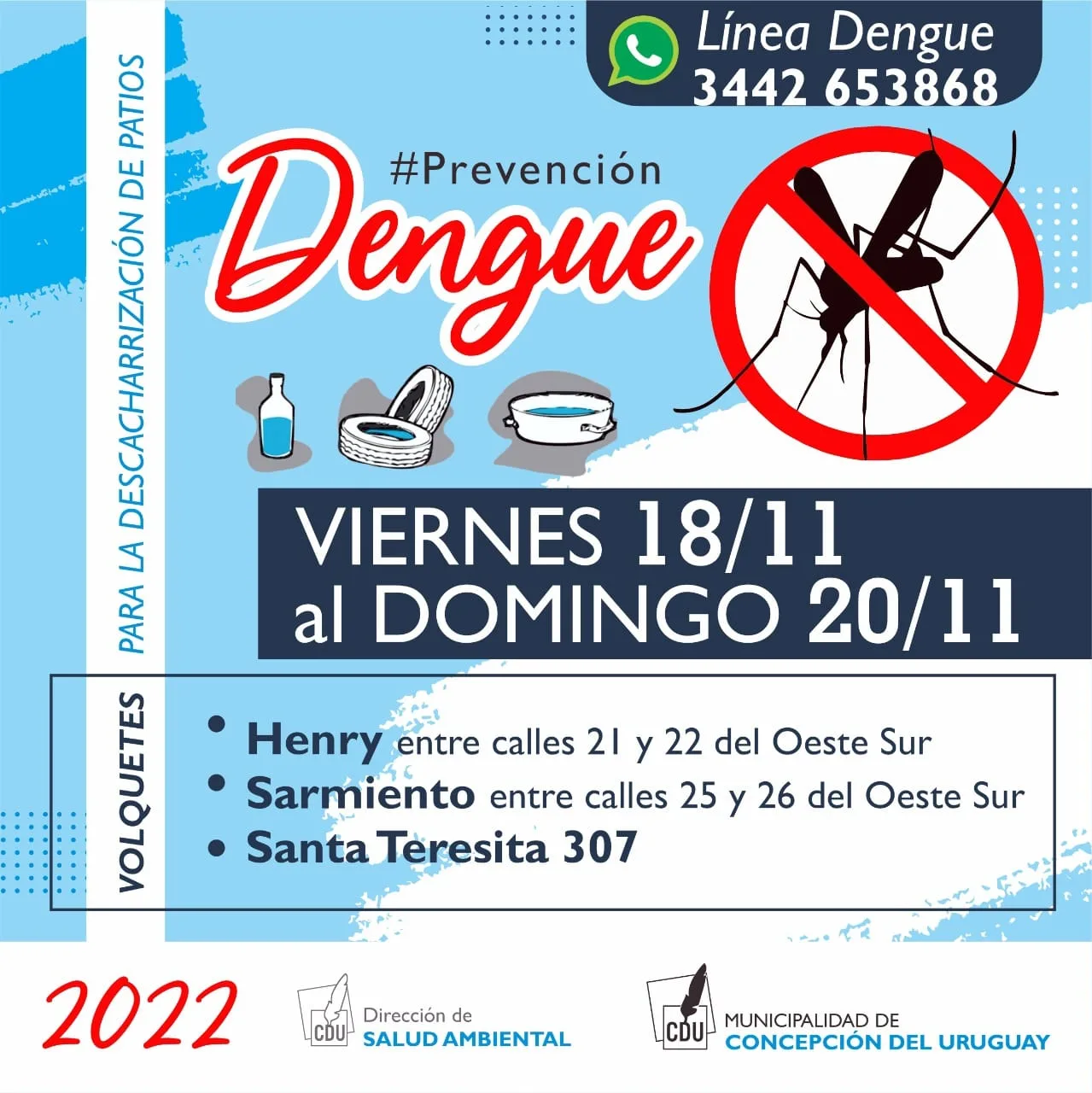 La Dirección de Salud Ambiental informa que continúa la campaña de descacharrización 2022/23, en el marco del “Plan Estratégico y Operacional para la Prevención y Control del Dengue”, en Concepción del Uruguay informó que la iniciativa consiste en promover la descacharrización, motivo por el cual se programa la instalación de volquetes en diferentes lugares de la ciudad, para que los vecinos puedan depositar allí los objetos que tengan en desuso. En esta oportunidad, los contenedores permanecerán del viernes 18 al domingo 20 de noviembre en los siguientes lugares: