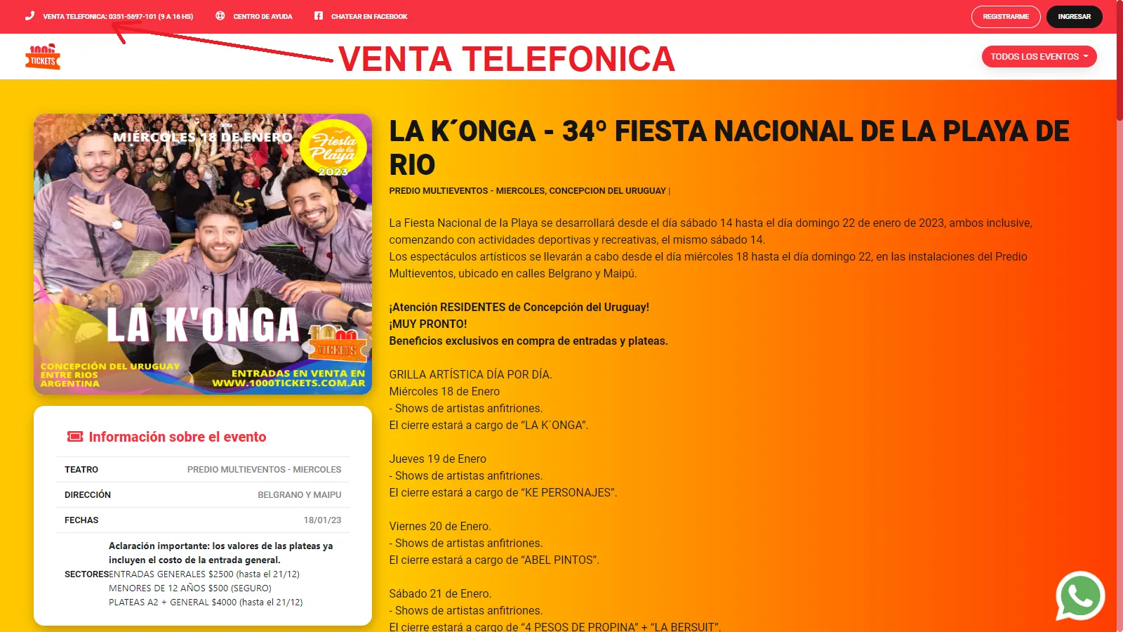 La fuerte demanda ocasionó algunas demoras en el sistema de ventas, por lo que durante hoy viernes y mañana sábado se agrega la venta telefónica, de 9 a 14 hs. al 03515697101. Además, en los próximos días se sumarán lugares para adquirir las entradas y plateas de manera presencial en Concepción del Uruguay.