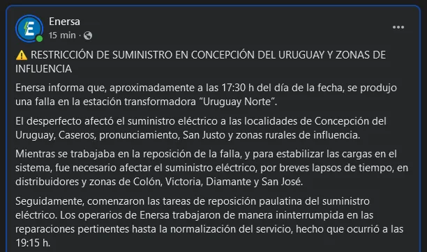 Según informaron desde la compañía, el personal de ENERSA ya se encuentra trabajando para resolver el inconveniente, aunque no se ha especificado el tiempo estimado para la normalización del servicio. La empresa aseguró que el suministro será restablecido “lo más pronto posible”.
