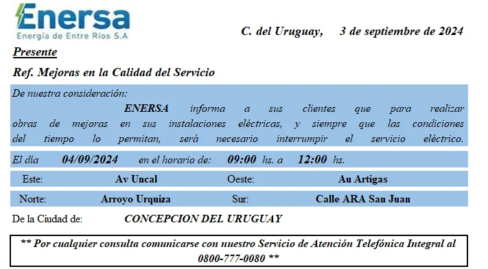 ENERSA informa a sus clientes que, con el fin de llevar a cabo obras de mejora en sus instalaciones eléctricas, será necesario interrumpir el suministro de energía en Concepción del Uruguay el próximo 4 de septiembre. La interrupción del servicio está programada para el horario de 09:00 a 12:00 horas, siempre que las condiciones meteorológicas lo permitan.